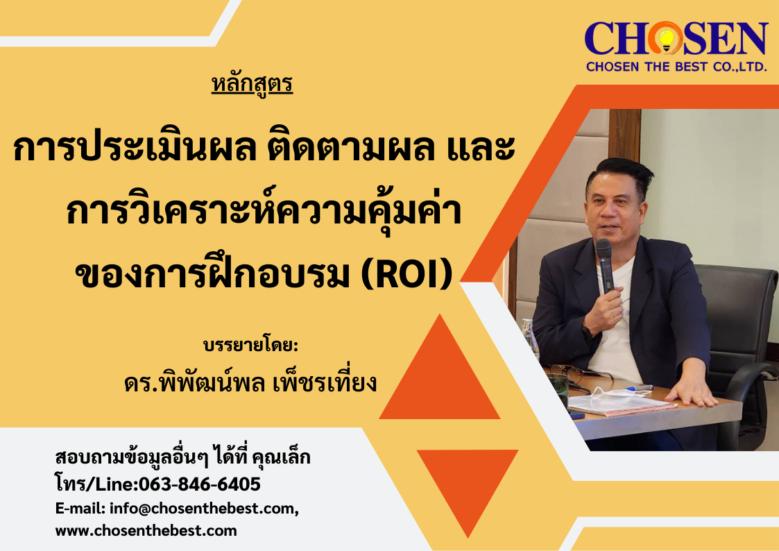 - การคำนวณค่าใช้จ่าย และประเมินผลตอบแทนจากการฝึกอบรมในเชิงความคุ้มค่าใช้จ่าย (ROI) และการคิดย้อนกลับความคุ้มค่าแบบ Productivity และ Satisfaction